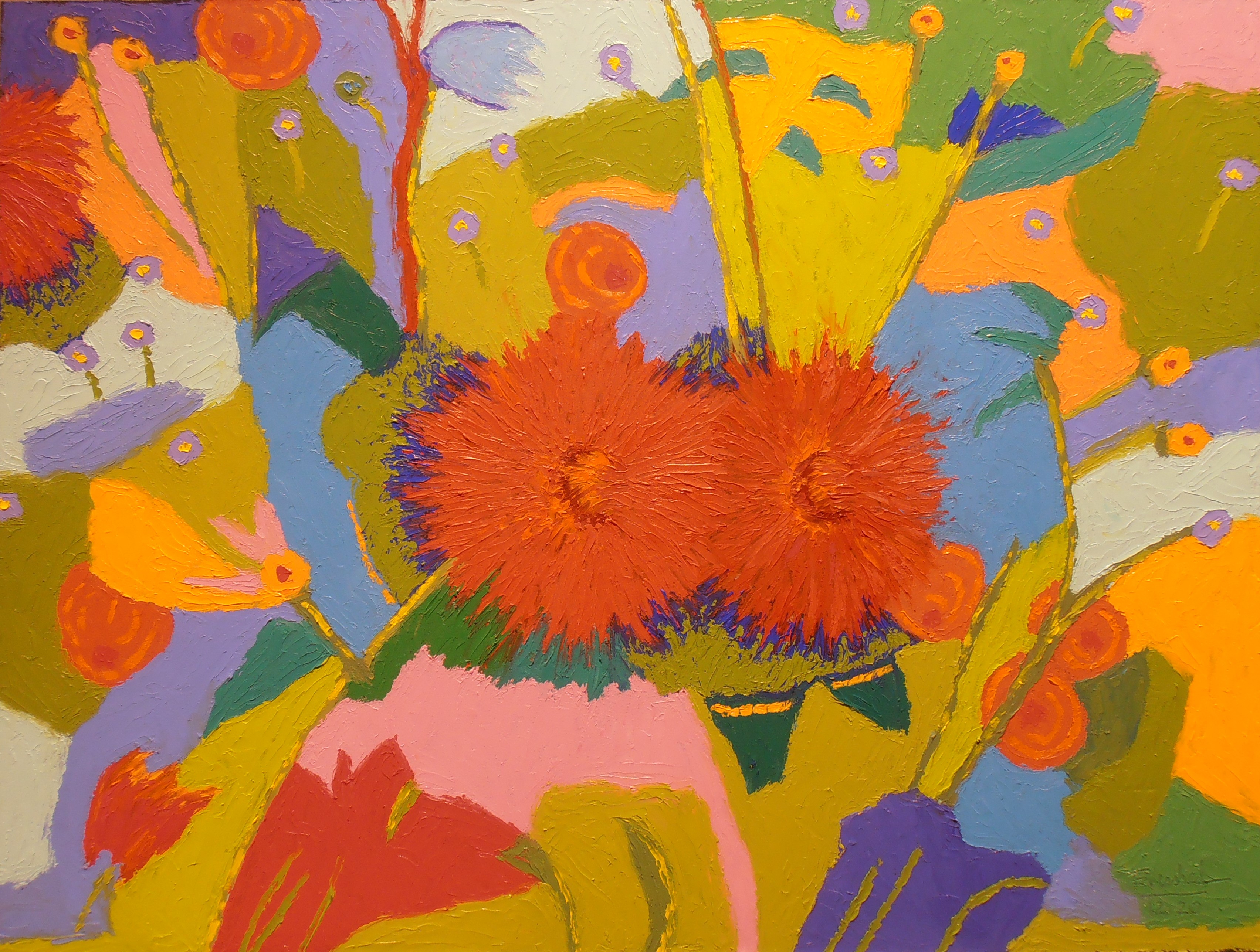 2 Red Dahlias ~ 18×24 ~ Oil on Panel ~ $450 framed